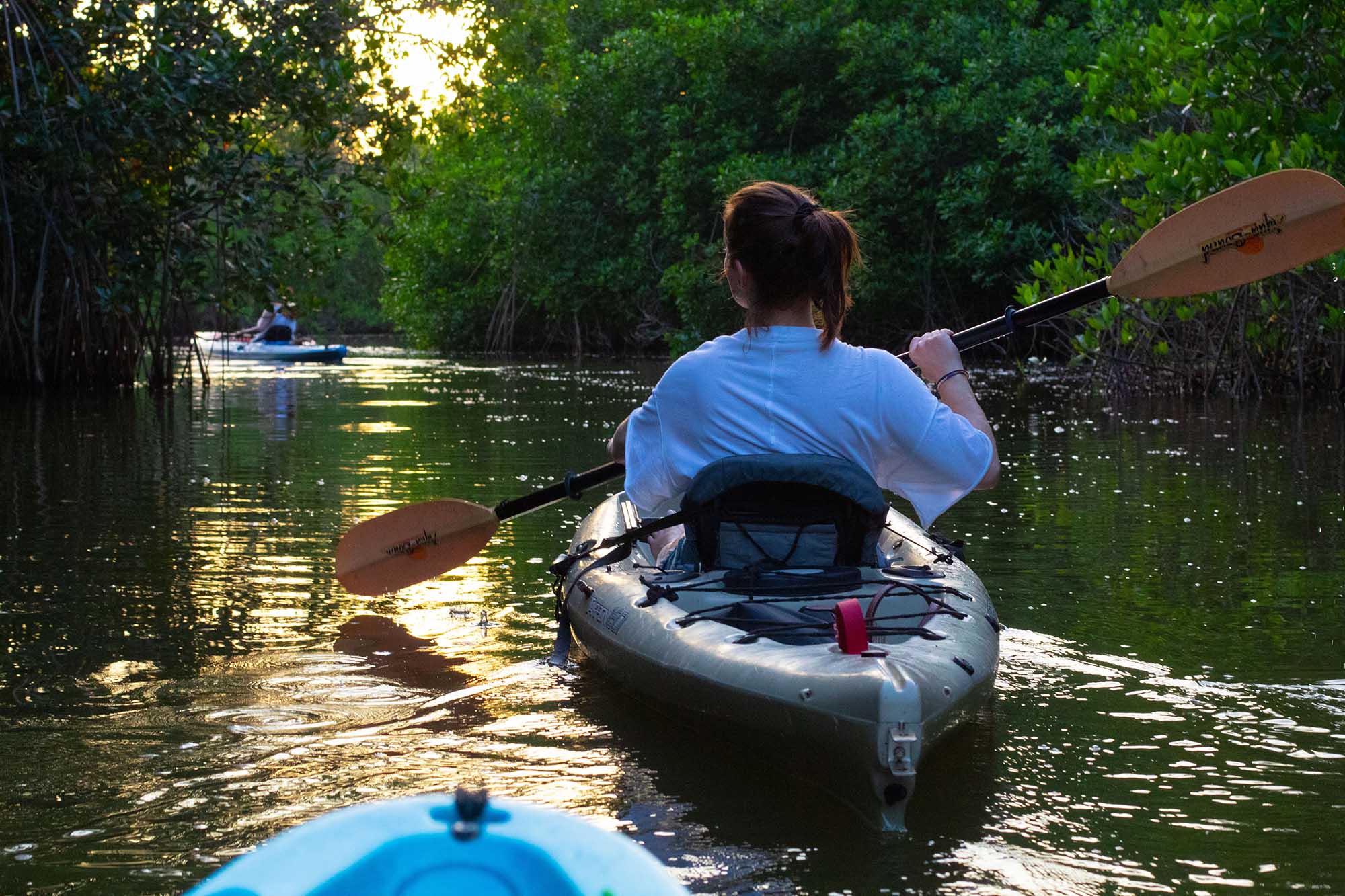 Paddle through tranquil waters as the sun sets, casting a golden glow over the mangroves.